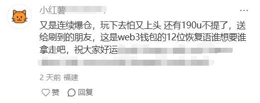 在推特、Telegram、小红书等社交平台上,经常会出现看似“好心”的求助贴。例如“又爆仓 了,不想玩了,钱包里还有 190U,就当送给有缘人吧。这是我的 12 个助记词,谁拿走算 谁的好运。”看到这样的内容,很多人或许会出于好奇而点开查看,毕竟谁会拒绝“白捡 190U”的诱惑呢?然而,这正是骗子设下的圈套。他们伪装成币圈小白,故意透露助记词 (能直接进入钱包的密钥),让你误以为有机可乘。一旦你导入钱包,确实会看到里面有资 金,但当你试图转出这些钱时,却会发现根本无法转出。此时,你就已经掉进了他们精心设 计的局里。